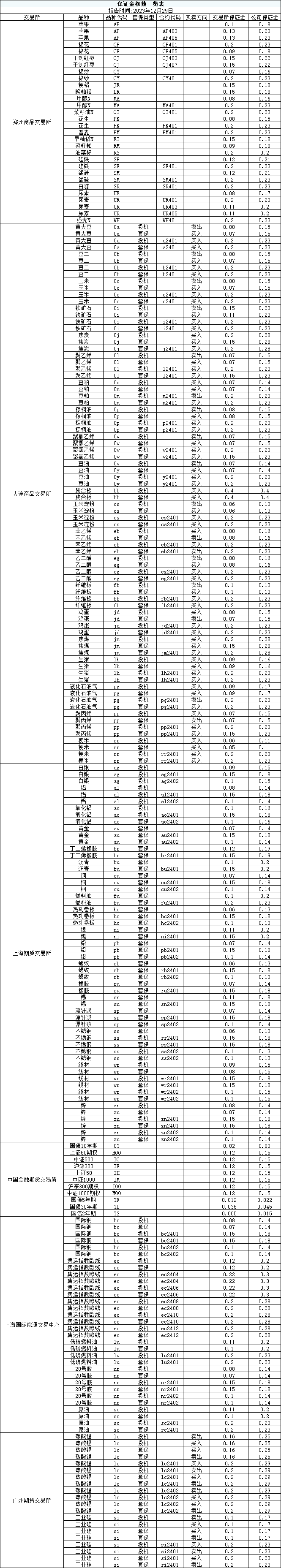 2023年12月29日保证金参数一览表