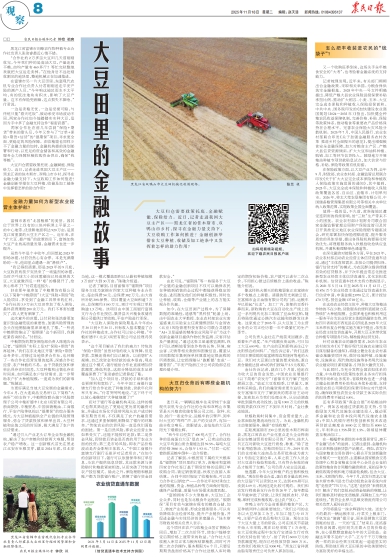 夕阳将最后一抹余晖洒向大地。送走今天的最后一辆运粮车后,付君关上粮库门,手机发出“滴滴”提示音,原来是销售大豆款到账的信息。一天的“监工”结束后,张洺睿仍然没闲着,他时刻关注着大豆的价格走势,在心里默默盘算起今年的大豆收益。金融这双看不见的“大手”,正为千千万万像他俩一样的农业经营主体筑起一道道坚实的防线,帮助他们将大豆田里的丰收美景转化为富裕美好的幸福生活。
